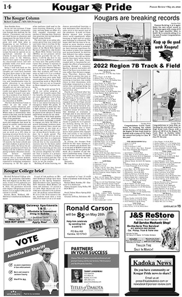 The next topic is an online education portal that was tested and used more than it ever has. At Kadoka Area, we currently use a di- vision of the Black Hills Special Services Cooperative, also known as Black Hills Online Learning (BHOL), as our primary online education provider for our students. I will be the first to say that the team at BHOL is as good as I have seen. The quality of education they produce is superior to other programs I have used. However, our state Smarter Balance Test data does not support the idea that students will tend to score as high in 9-12 as a student in the classroom at this time. Al- though we have seen some high scores produced due to the team’s outstanding work at Black Hills Online, they are not as frequent as those engaged as in-person students.